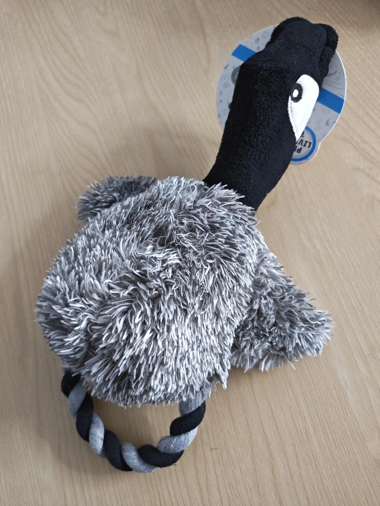 Plush Duck toy with squeaker and handle for throwing and playing tug.